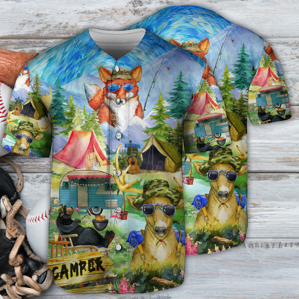 Camping Happy Animals Art Style – Baseball Jersey – Chic Loom