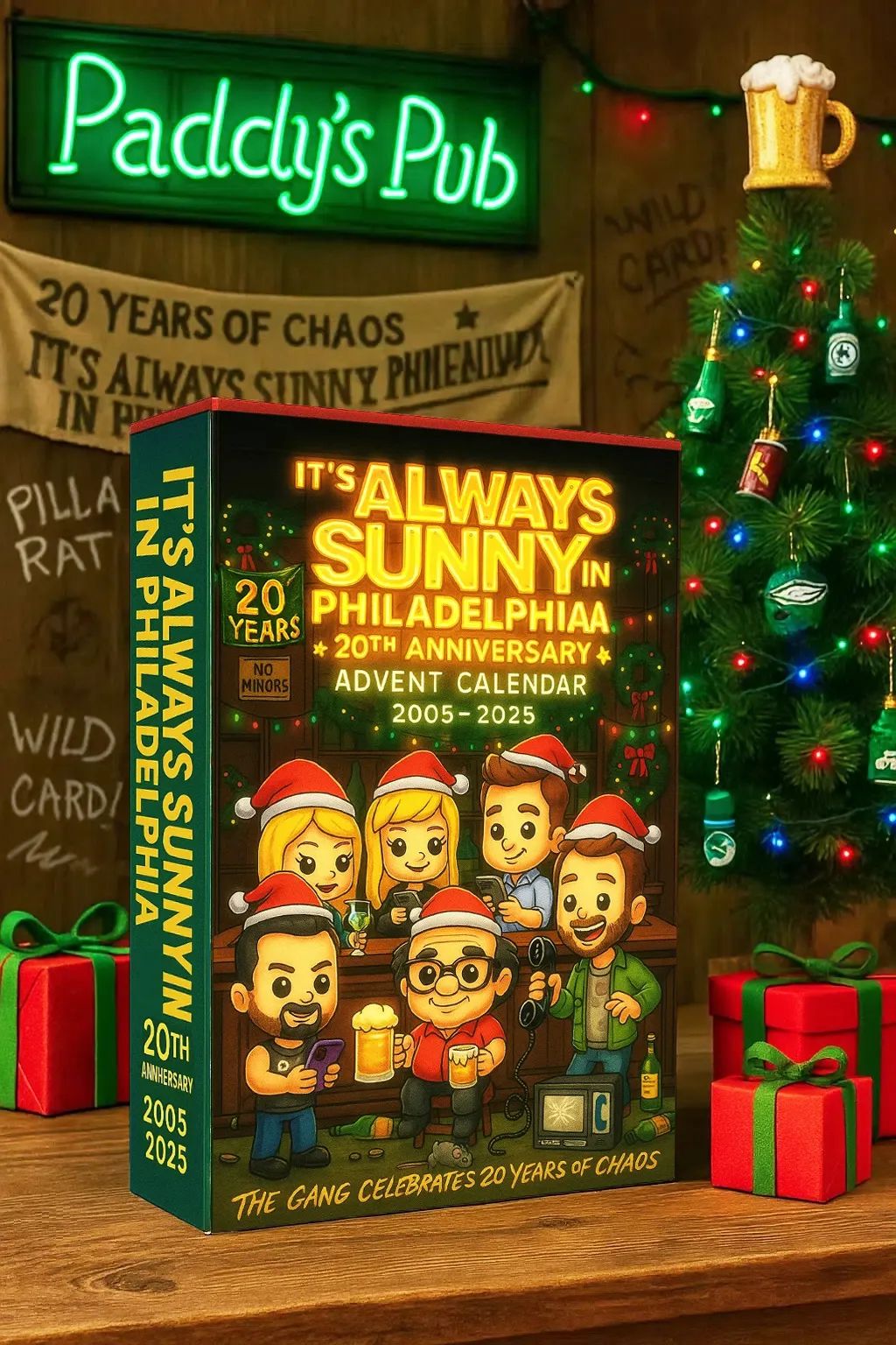 The calendar box is beautifully styled to reflect the It Always Sunny in Philadelphia legacy and holiday spirit: