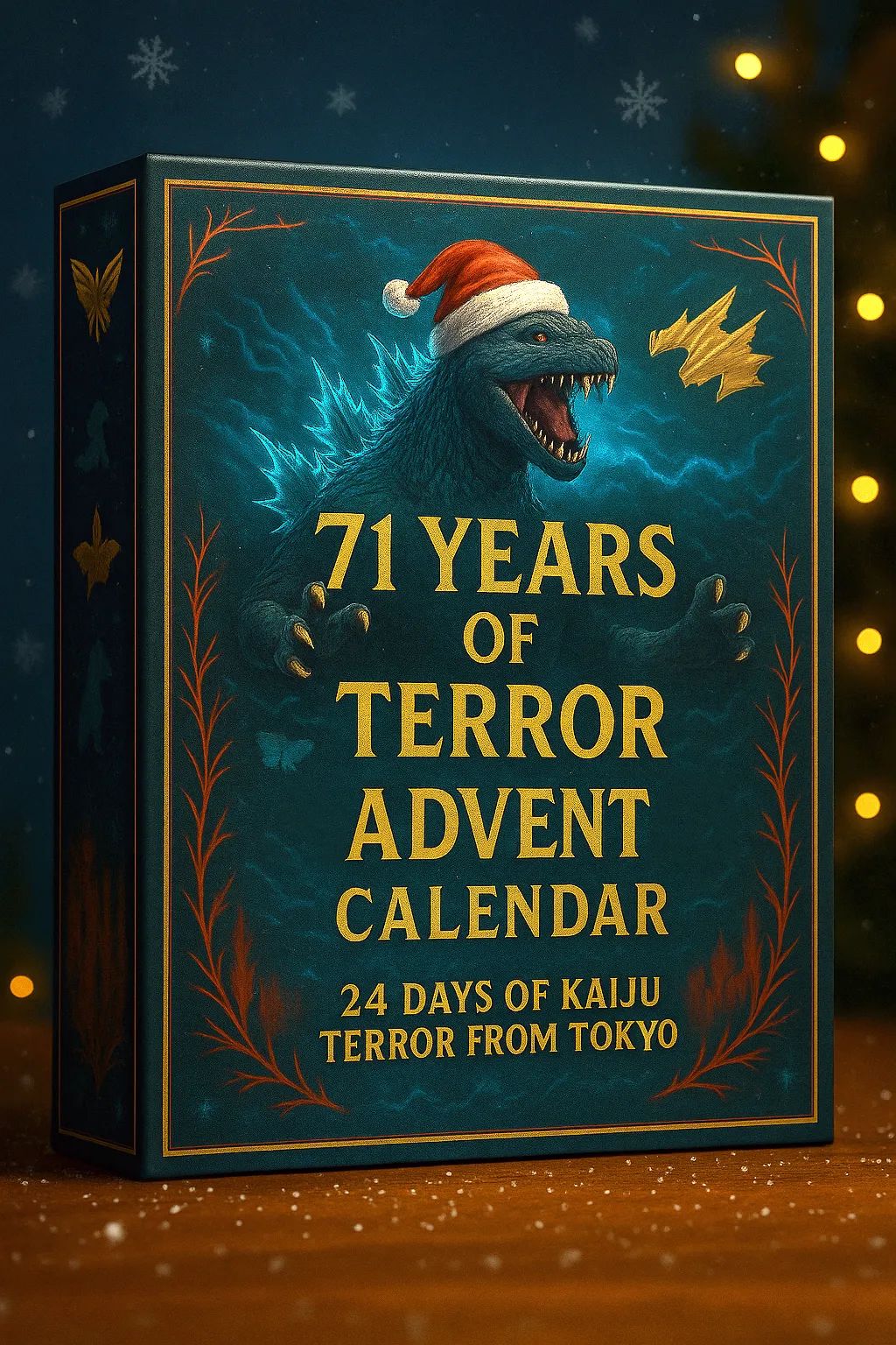 The calendar box is beautifully styled to reflect the Kaiju Godzilla legacy and holiday spirit: