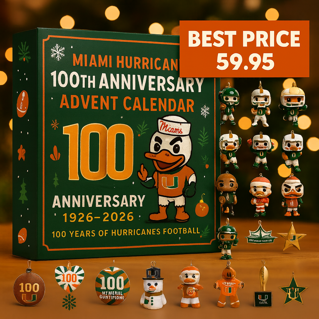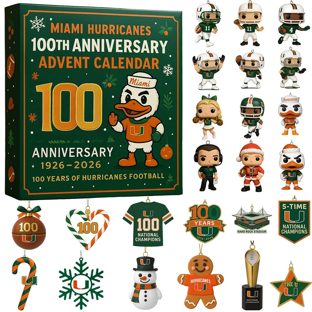 Miami Hurricanes Advent Calendar 2025 is a special gift that allows fans to commemorate the 100th anniversary of the team (1926 “2026) while counting down to Christmas in the blazing excitement of The U . The unique green-orange design box, highlighted by mascot Sebastian the Ibis, perfectly combines the festive holiday spirit with the thrill of Miami Hurricanes football. Inside the advent calendar box, you’ll discover 24 surprise gifts including Funko Pop mini figures and collectible accessories: Hurricanes players in various uniforms, Sebastian the Ibis in Christmas form, coaches, cheerleaders, and a series of icons representing Miami football history. Special extras include 100 National Champions jerseys, championship trophies, Hard Rock Stadium, Hurricanes gingerbread, snowmen, Christmas candy, snow globes, and exclusive 5-time National Champions designs. Every detail is expertly crafted, and each item comes with a hanging string so you can easily decorate your Christmas tree, brighten your study corner, or proudly display them on a shelf. The Miami Hurricanes 100th Anniversary Advent Calendar 2025 is more than a countdown to Christmas ”it is a celebration of a glorious century of Miami Hurricanes football history. If you’re a fan of The U , this calendar will turn December into a month of daily surprises, filling your holiday season with festive joy, team pride, and sportsmanship spirit. An unforgettable gift from the heart for every true Miami Hurricanes fan!