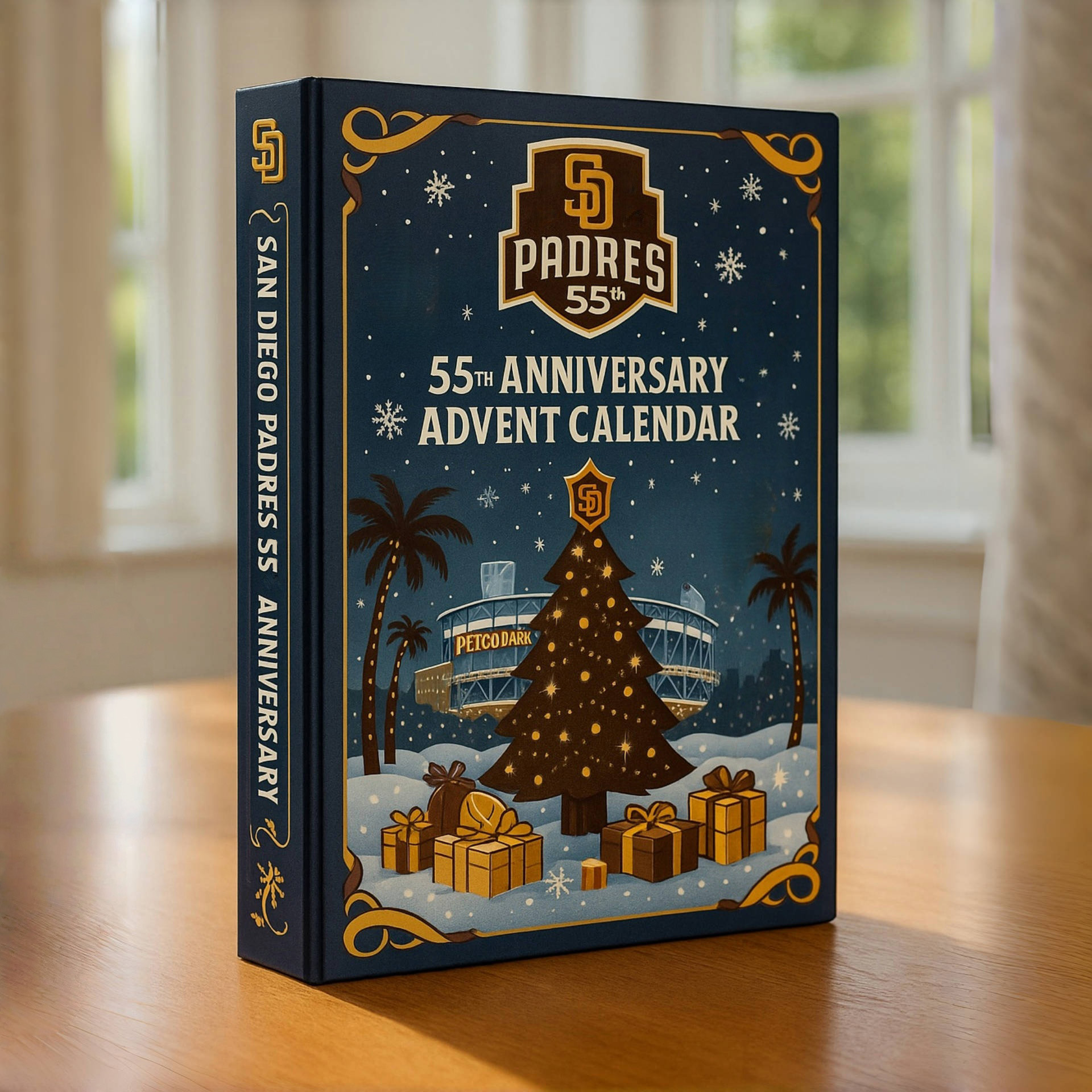 The calendar box is beautifully styled to reflect the NEW San Diego Padres legacy and holiday spirit: