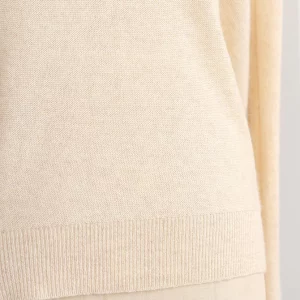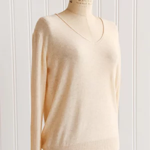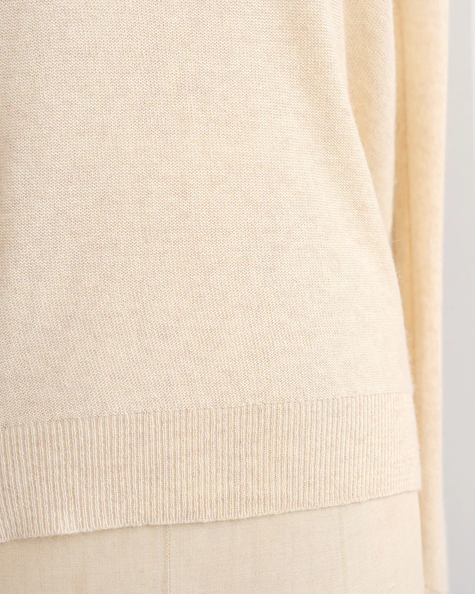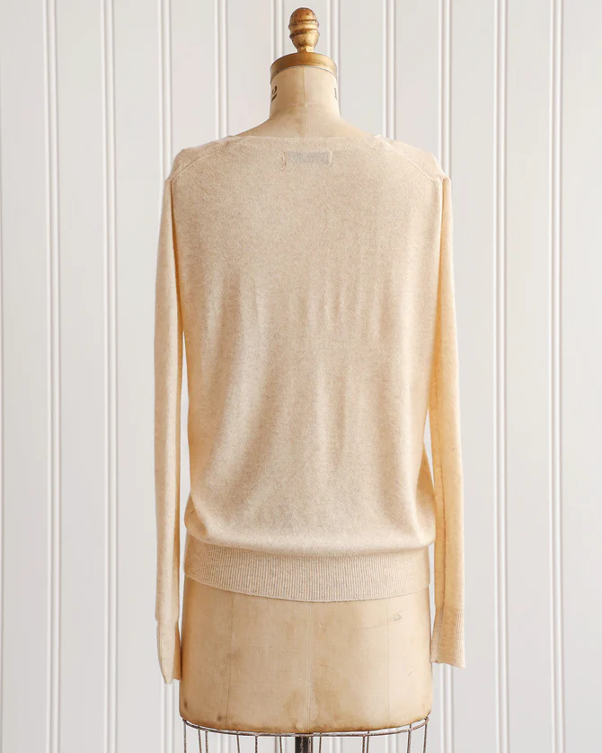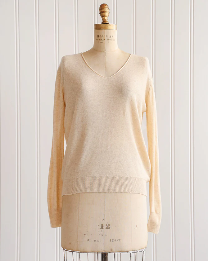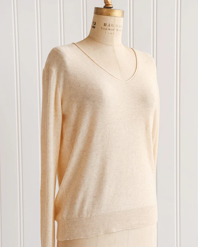 Classic feminine lightweight cream knit sweater with soft v-neckline featuring rolled hem. Easy to wear and the perfect layering piece for cooler summer nights and great to bring into Fall.