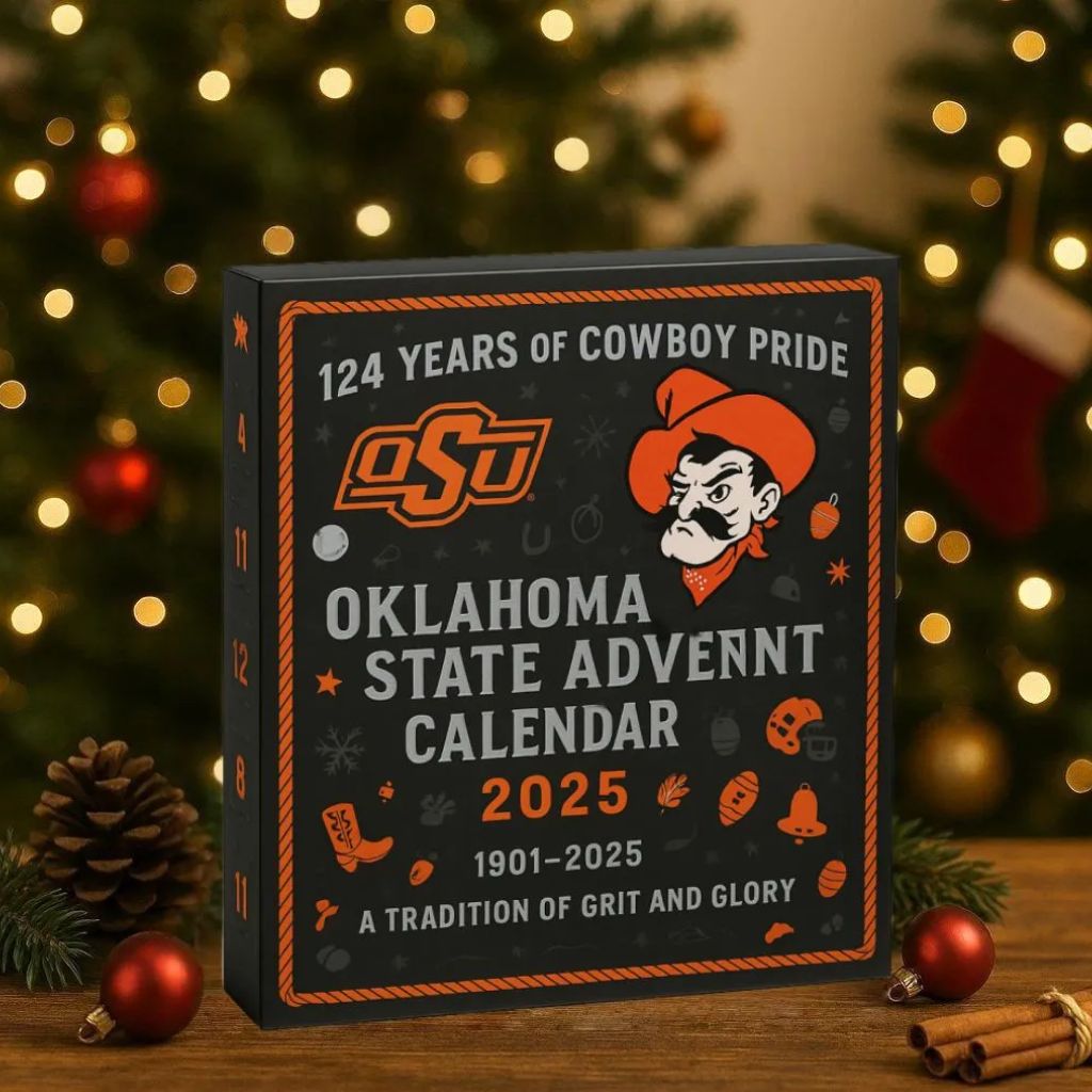The calendar box is beautifully styled to reflect the Oklahoma State Cowboys legacy and holiday spirit: