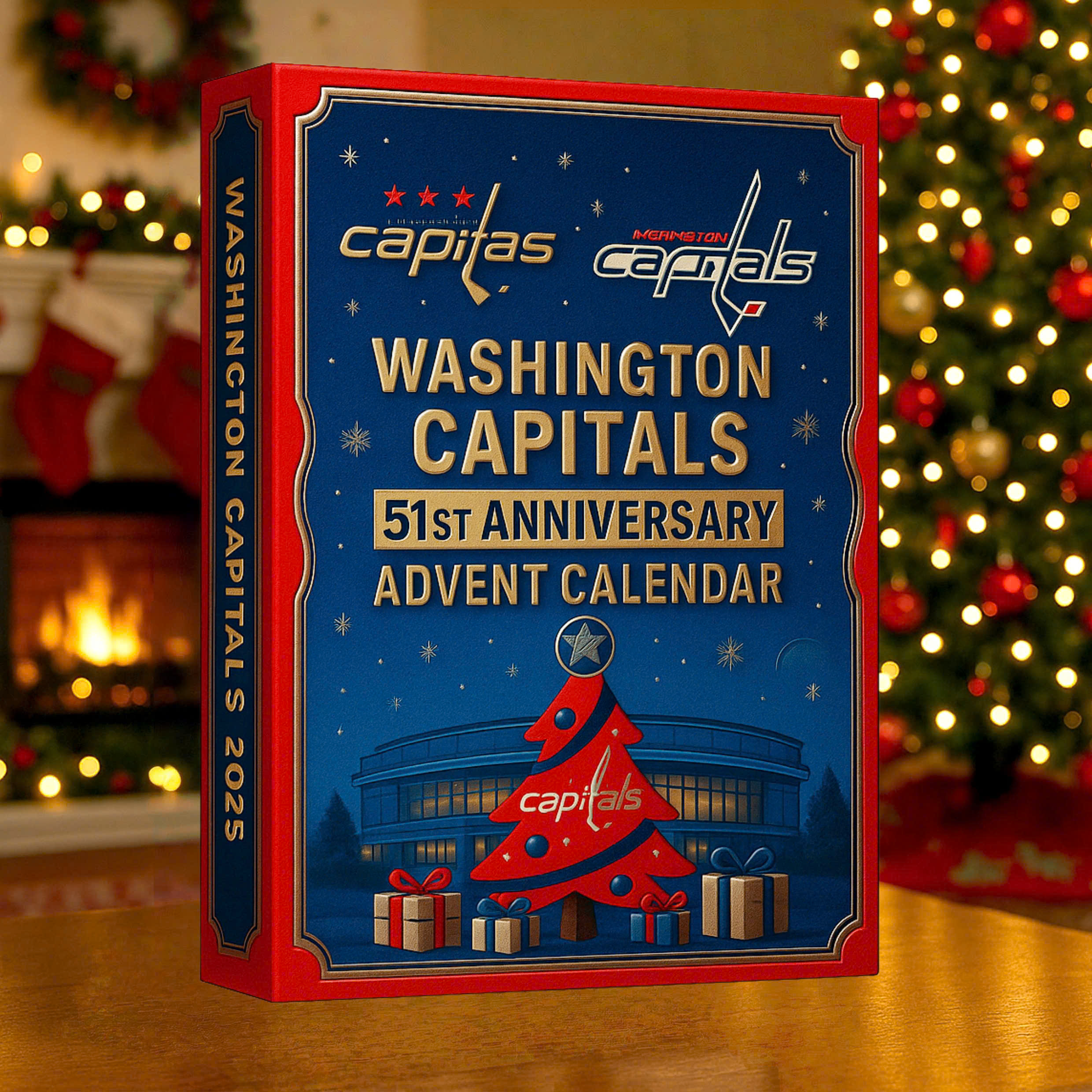 The calendar box is beautifully styled to reflect the Washington Capitals legacy and holiday spirit: